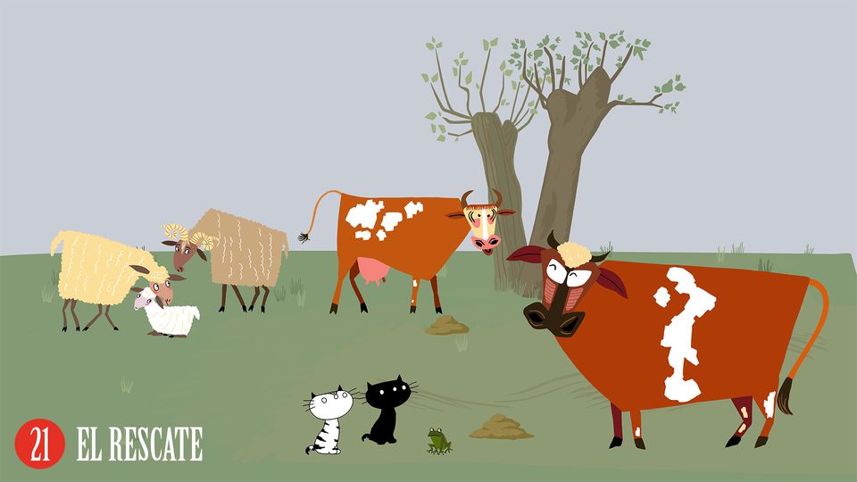 Cuando Pim y Pom visitan al impresionante "toro" de Potter y su séquito, un pajarito les avisa de que se avecinan tormentas y fuertes lluvias. Pim y Pom van a avisar al ganado del valle de que es hora de que se reúnan con el toro en tierras más altas. Pero una vaca se niega obstinadamente a abandonar el prado. En un intento por rescatarla, Pim y Pom se encuentran con el agua hasta el cuello, por lo que la vaca tiene que llevarlos a un lugar seguro.