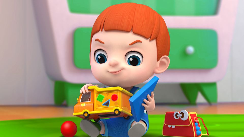 Domi was driving with a bunch of beach balls in the car when he passed over a speed bump. As the car went over, the round, square, and triangular shapes fell off, spilling the beach balls. After thinking for a moment, Domi took out a small hammer to fix the car. First, he shoved the triangle into the corresponding hole, then tried to fit the circle into the square hole, but quickly corrected it. Finally, Domi put the square into its proper hole, fixed the car, and continued driving with the beach balls onboard.