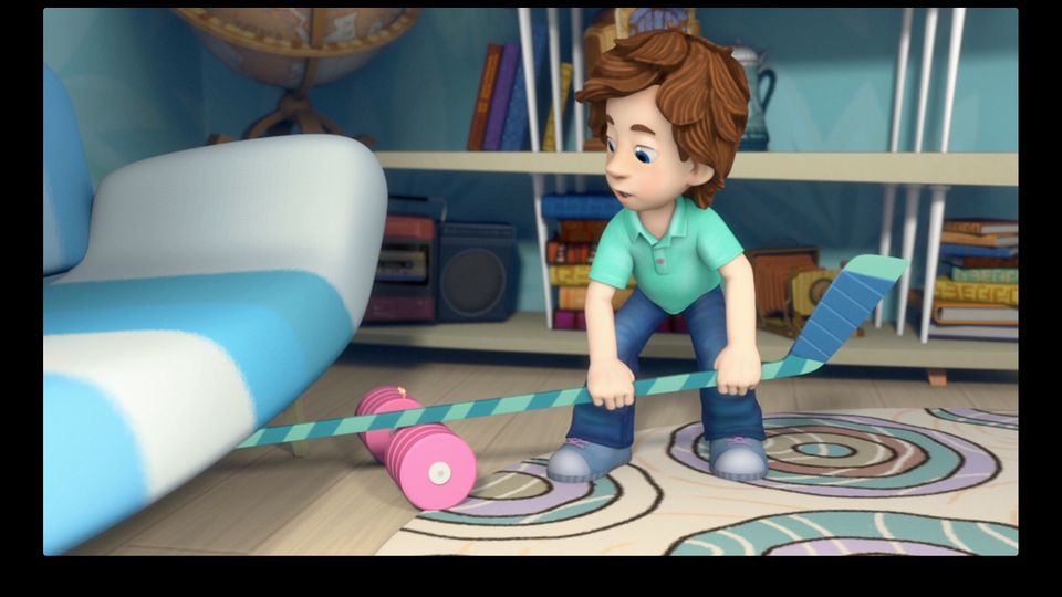 Tom Thomas is unable to get a barbell out from underneath the sofa. The Fixies teach him how to use his hockey stick as a lever to lift the sofa and retrieve the weight.
