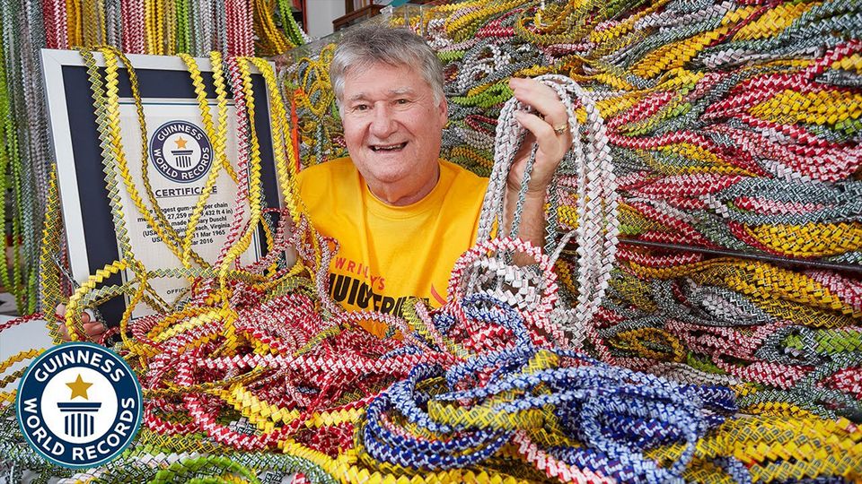 Longest gum wrapper chain Longest gum wrapper chain 0:04:11 / 2025 / TV-Y The longest gum wrapper chain is 32,555.68 m (106,810 ft), and was achieved by Gary Duschl (USA) in Virginia Beach. Virginia, USA, on 10 January 2020. Categories Adventure More from Incredible Record Breakers: Collections More from Adventure Recommended