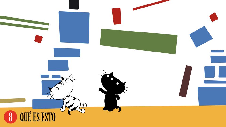 Mientras Pom intenta ordenar los bloques y cuadrados del cuadro de Malevich, Pim salta de un bloque a otro. Pom no tarda en darse cuenta de que es imposible organizarlos: los bloques y los cuadrados se mueven por todas partes. Por eso es tan divertido jugar con ellos, grita Pim, mientras salen disparados en un cohete espacial hecho de bloques y cuadrados.