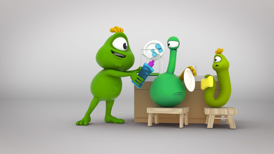 While Popodom and Drod are doing the dishes, Migol entertains himself by blowing bubbles from a soap bottle. Suddenly a spaceship comes out of there and abducts Migol into the bottle.