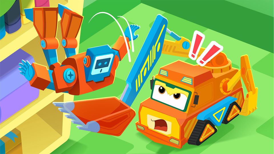 A robot toy accidentally fell off the table and broke. The toys called for help from the Super Cars. The taxi and the excavator rushed out and searched through the messy room for the robot's missing parts. In the end, they managed to put the robot back together.